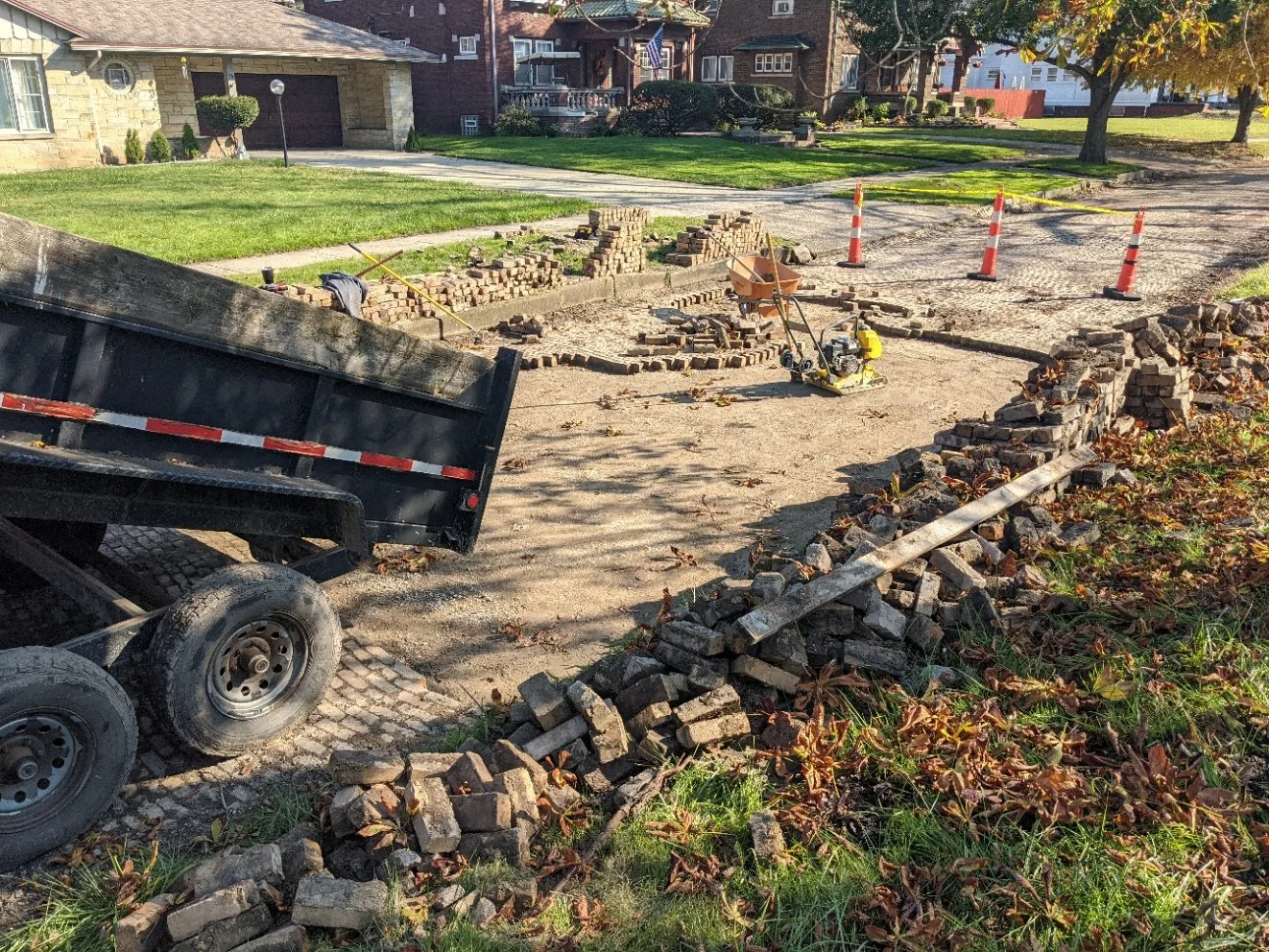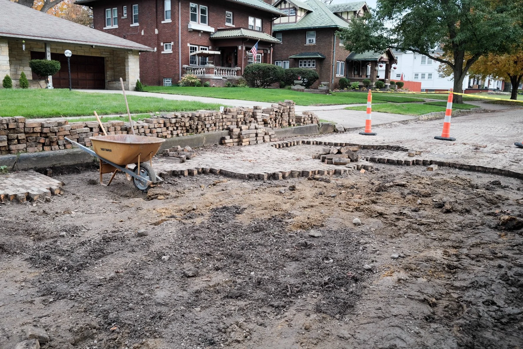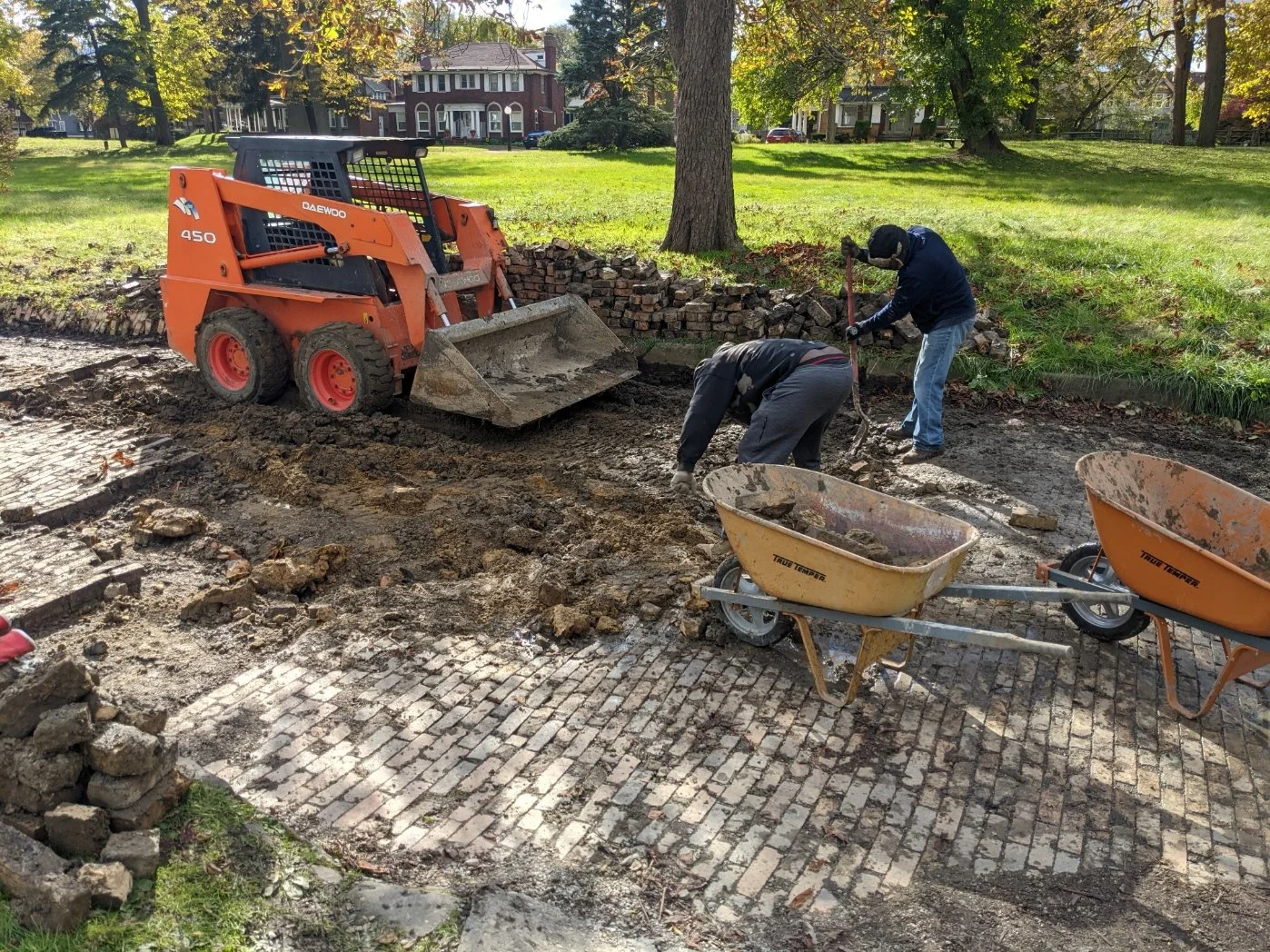 Bricks pressed deep in the moist clay beneath the street were difficult remove. Depicted above, a bobcat helped to speed up the removal process.